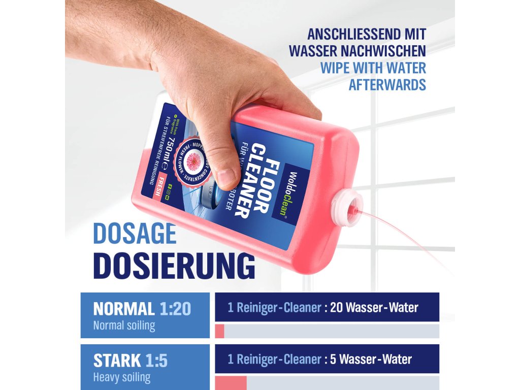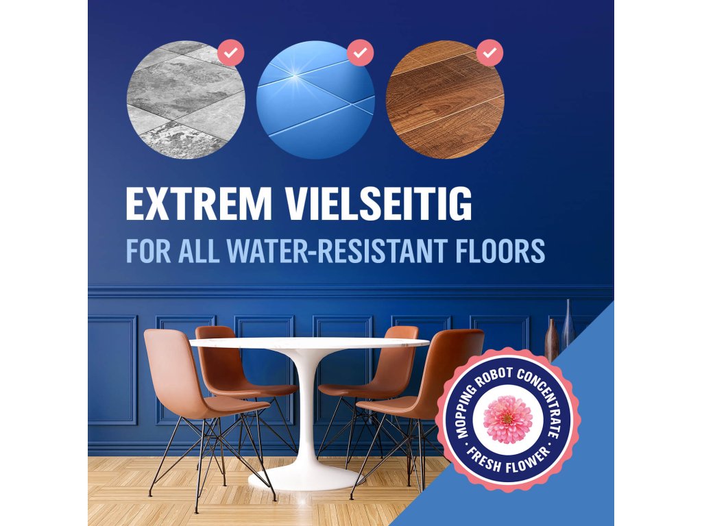Minden típusú padlóhoz alkalmas – fa, PVC, csempe és linóleum esetén is. Gyógyszerészeti körülmények között Németországban gyártva és tesztelve, kiváló minőségű és biztonságos összetevőkből. Kíméletes a felületekhez és környezetbarát.