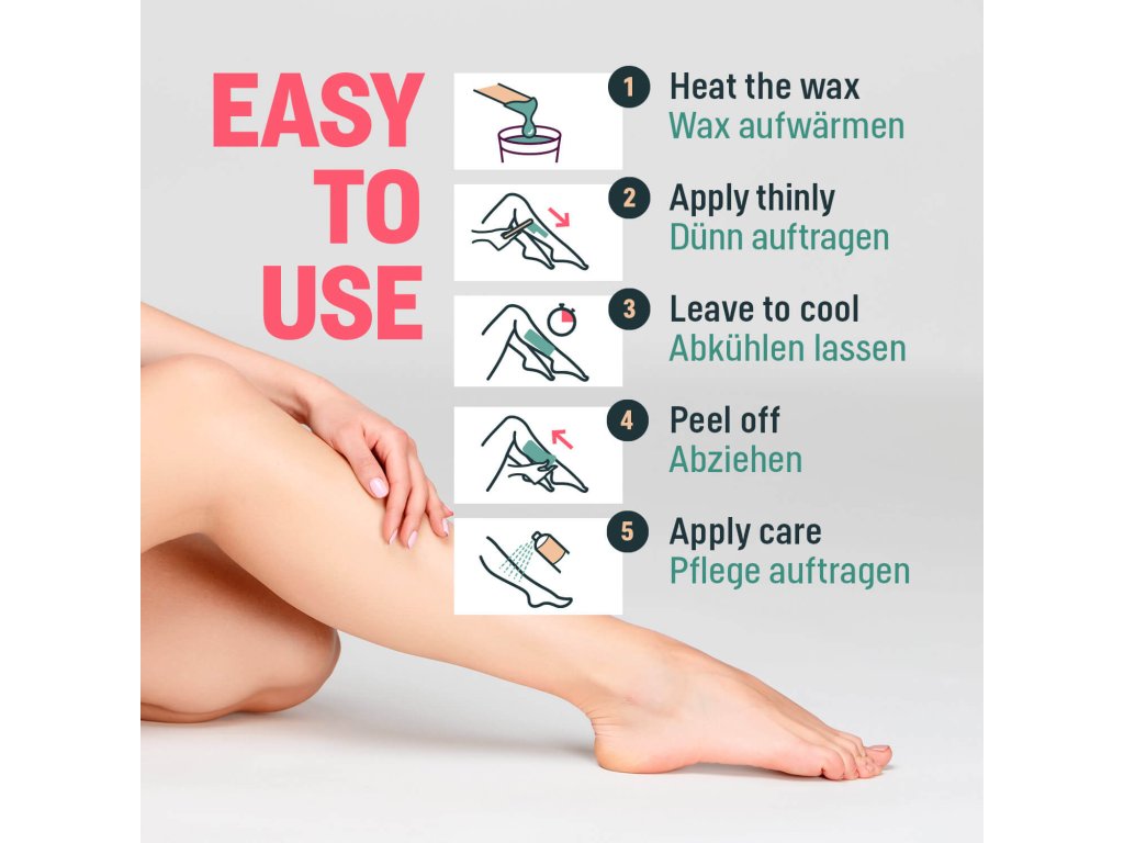 Használat: Melegítsd fel a viaszt melegítőedényben vagy vízfürdőben. A viasz legyen teljesen megolvadt (krémes állagú), jól elkeverve és langyos. Használat előtt ellenőrizd a hőmérsékletét úgy, hogy egy kis mennyiséget felviszel a csuklód belső oldalára.