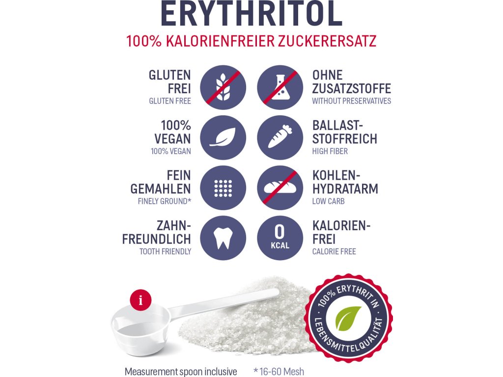 Az eritrit kalóriamentes, természetes eredetű édesítőszer, amely fogbarát. Ideális alacsony kalóriatartalmú étrendhez.