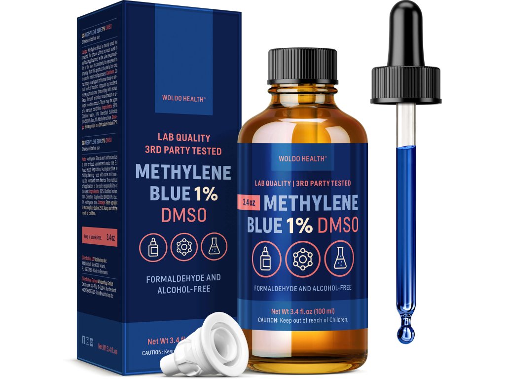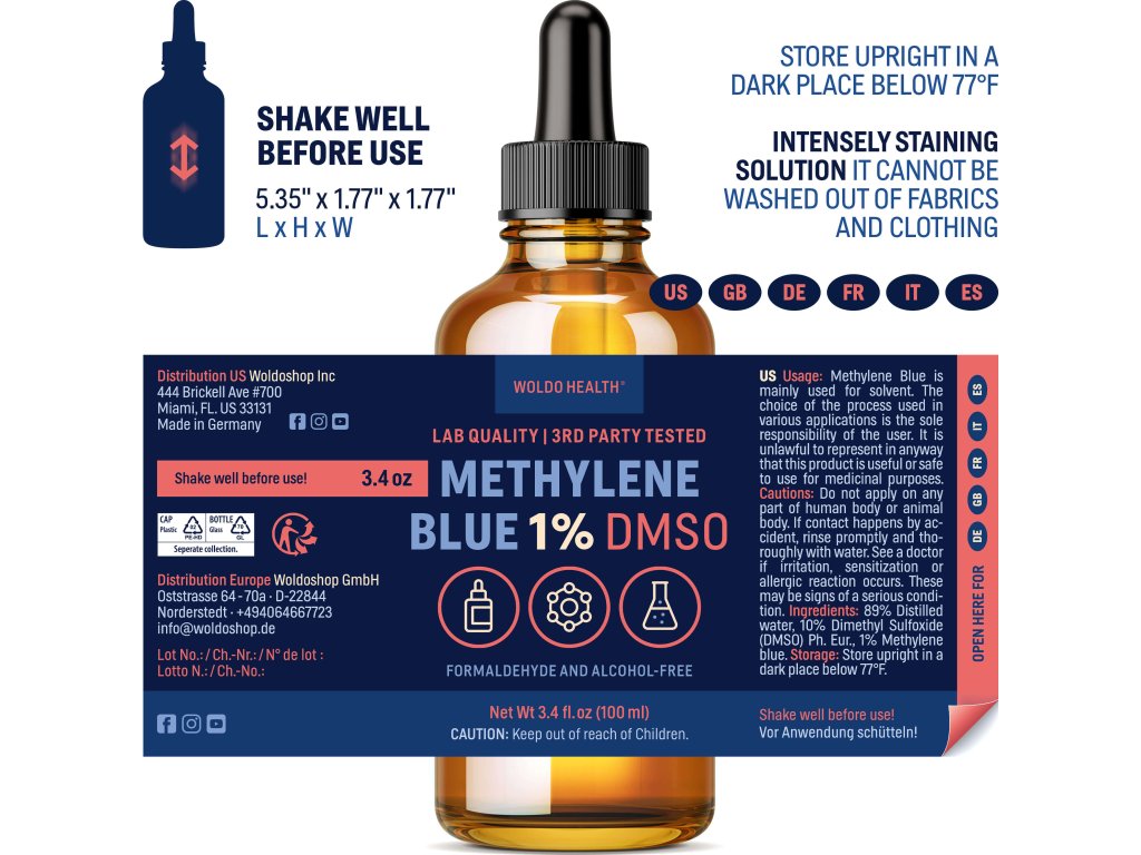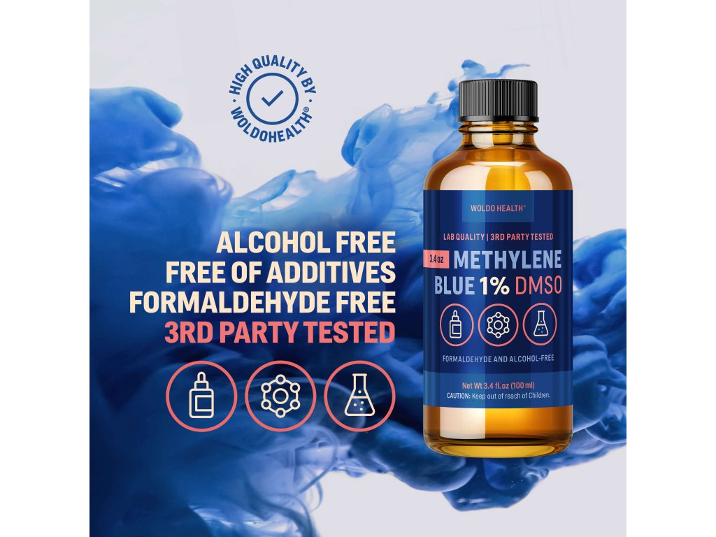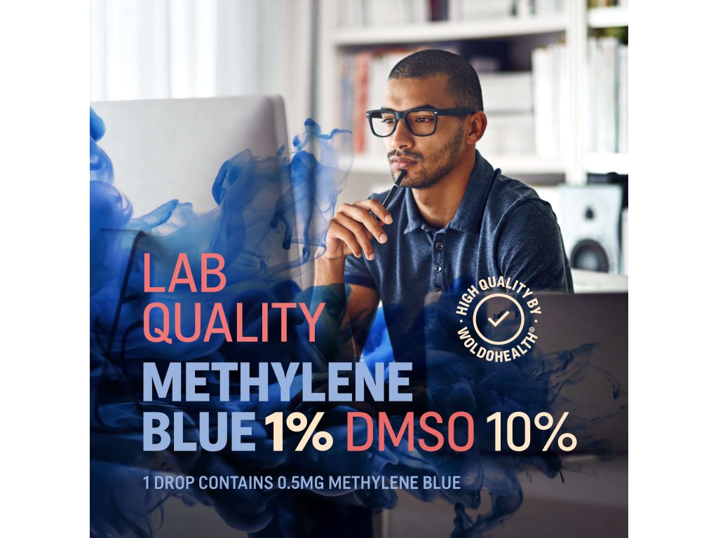 Metilénkék 1% + DMSO laboratóriumi oldat a Woldohealth® márkától egy gondosan előállított keverék magas tisztasággal. Tartalmaz 1% metilénkéket és 10% dimetil-szulfoxidot (DMSO) desztillált vízben. Minden gyártási tételt független laboratórium tesztel, és a termék nem tartalmaz alkoholt, formaldehidet vagy más adalékanyagokat.