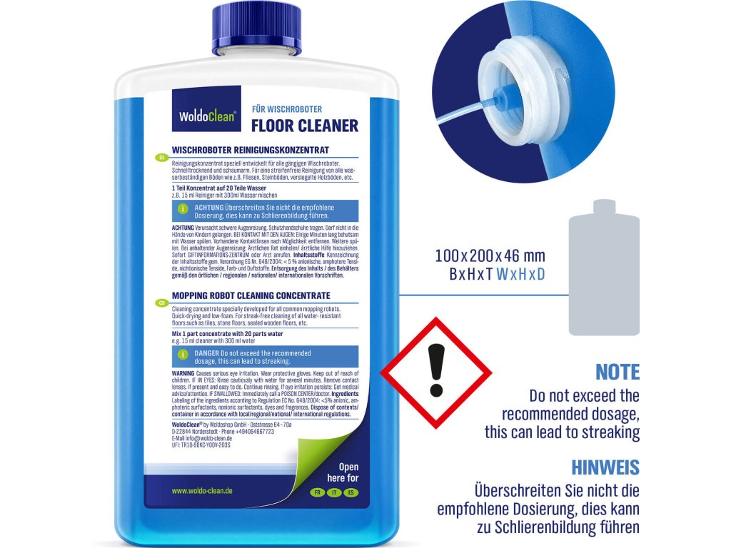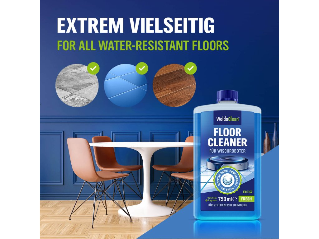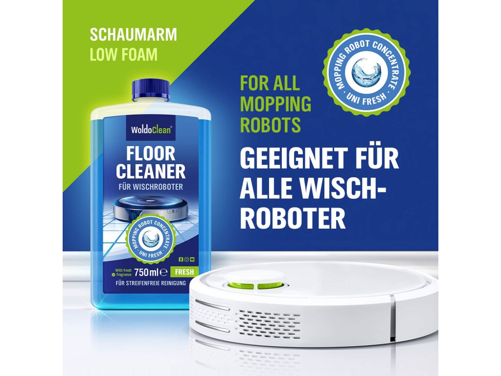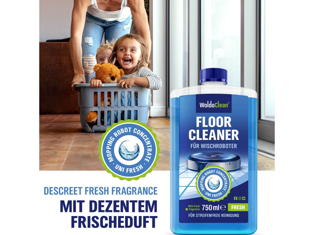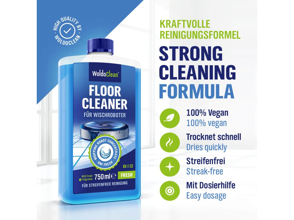 Kompakt méretének és praktikus kialakításának köszönhetően a nehezen hozzáférhető helyeket is eléri. A WoldoClean univerzális padlótisztító robotmopokhoz csíkmentes tisztaságot biztosít, miközben kellemes illata felfrissíti az egész otthonodat.