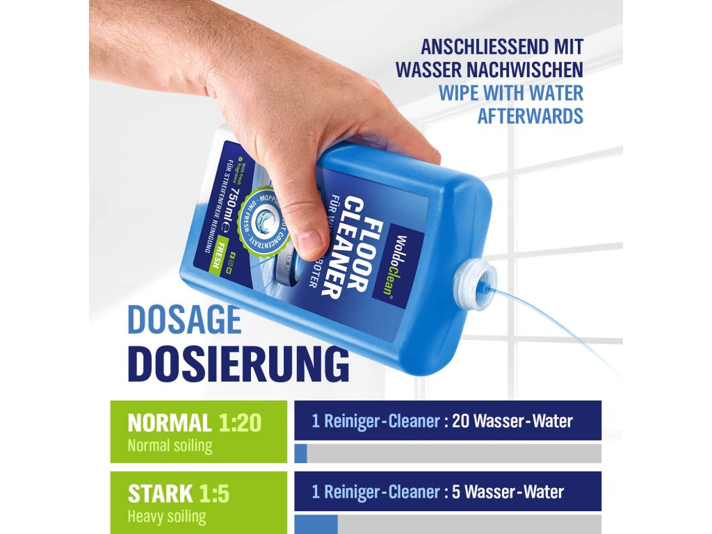 A készítmény minden típusú padlóhoz alkalmas – legyen szó laminált padlóról, csempéről vagy vinilről. Magas koncentrációjának köszönhetően már kis adagban is hatékony tisztítást biztosít. A termék gyógyszerészeti körülmények között lett kifejlesztve és tesztelve Németországban, kiváló minőségű, környezetbarát alapanyagokból.