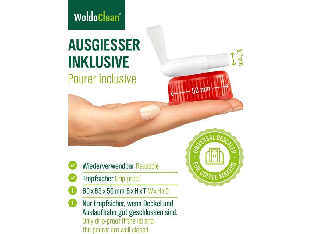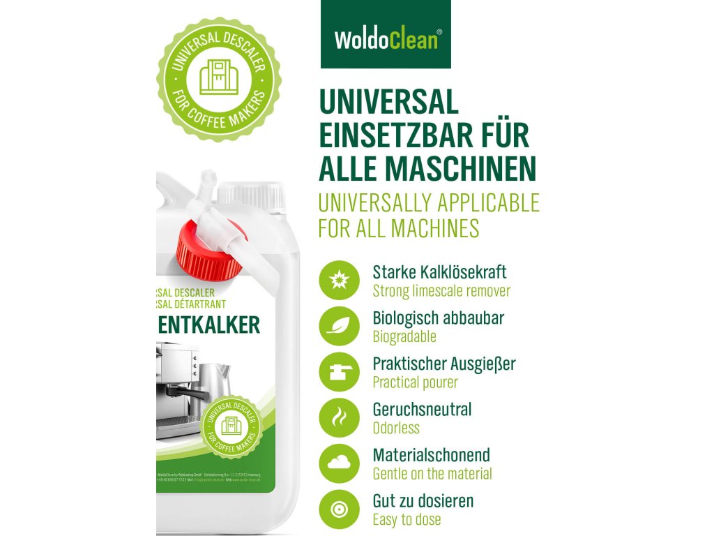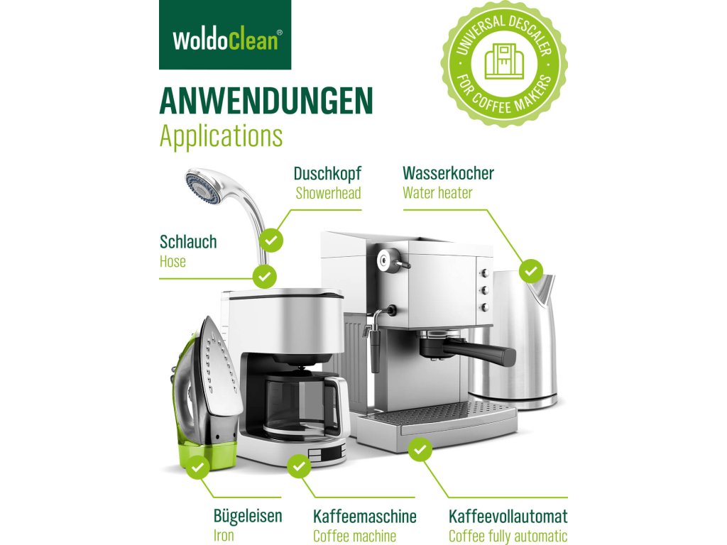 A WoldoClean vízkőoldó megbízhatóan eltávolítja a vízkövet és a mészlerakódásokat kávéfőzőkből, vízforralókból, gőzsütőkből, mosogatógépekből, mosógépekből, gőztisztítókból, gőzgenerátorokból és más készülékekből.