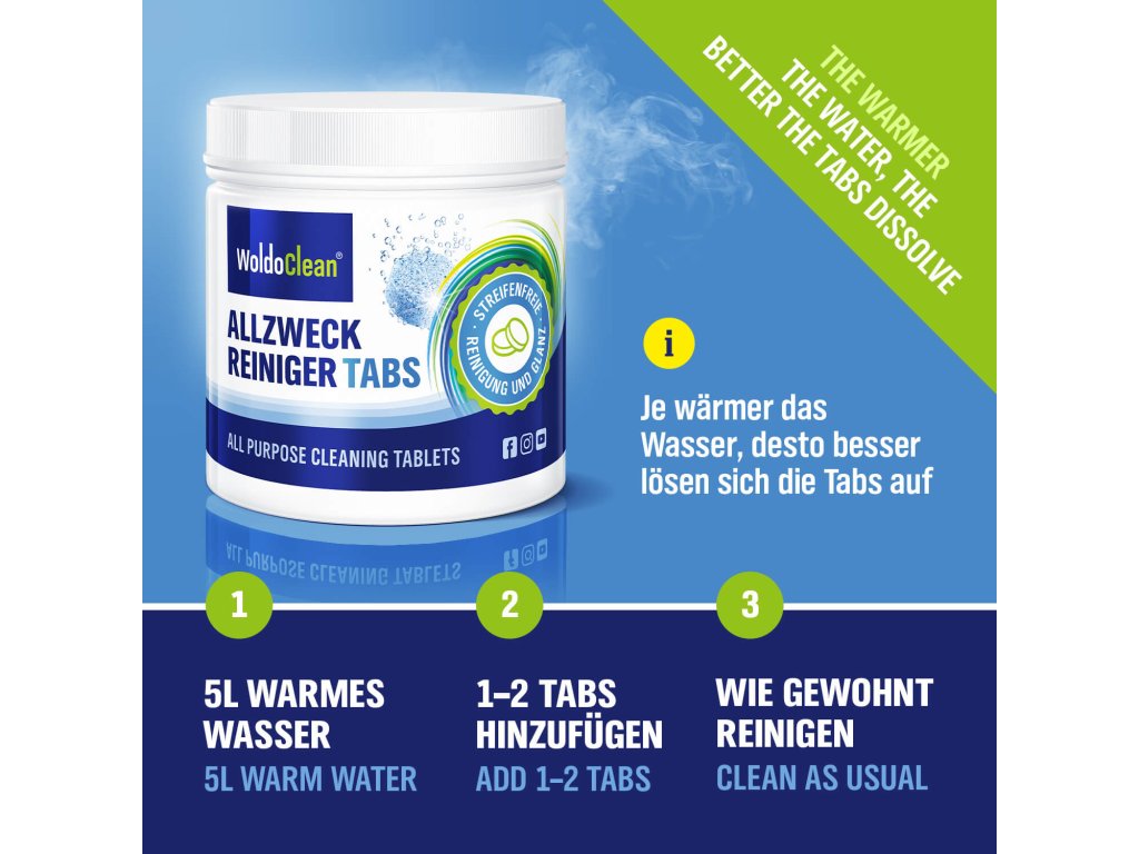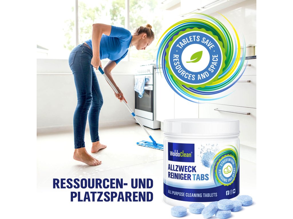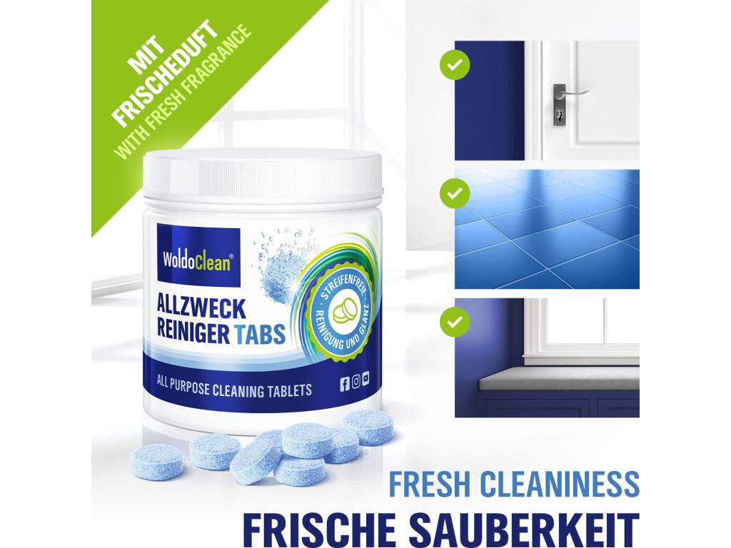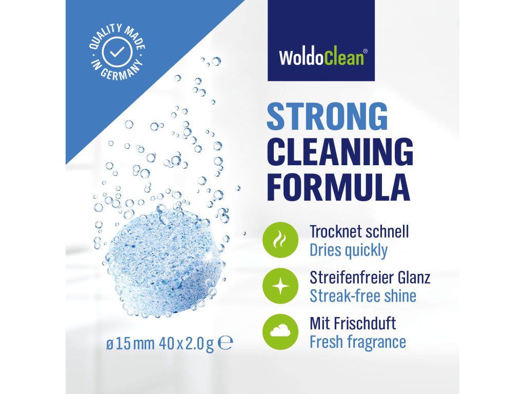 A WoldoClean tisztítótabletták minden mosható felülethez alkalmasak a háztartásban. Alapos, csíkmentes tisztítást biztosítanak, kellemes friss illattal és hosszan tartó ragyogással. Ideálisak a konyha, fürdőszoba, padlók és más felületek mindennapi tisztításához.